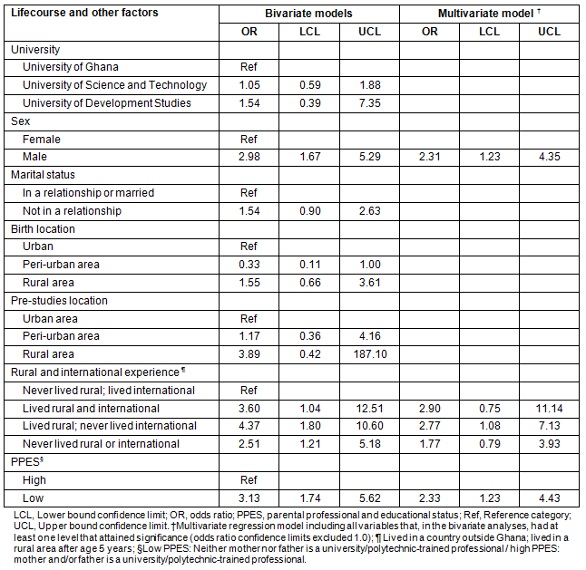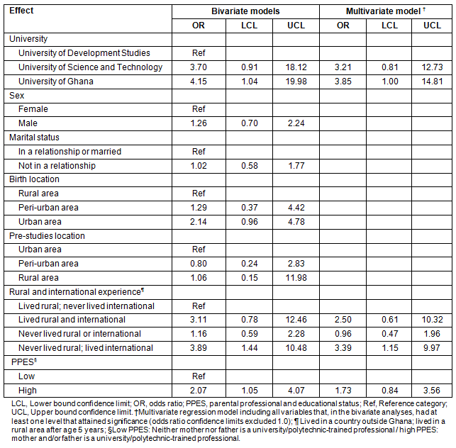 The results of the bivariate analyses of lifecourse factors and considering emigration after graduation are shown (Table 3). Students from UG were more than four times as likely to have considered emigration as those from UDS (OR 4.15, 95%CI: 1.04-19.98). Those with international but no rural experience were almost four times as likely to have considered emigration, compared with those with rural but no international experience (OR 3.87, 95% CI: 1.44-10.48). Those with a higher family PPES were more than twice as likely to have considered emigration (OR 2.07, 95%CI: 1.05-4.07) compared with those with a lower family PPES.