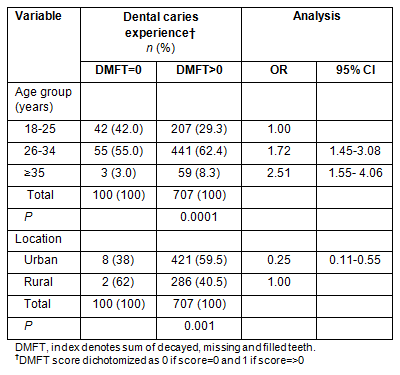 Results are shown for the binary logistic analysis of DMFT for the overall sample of 807 pregnant women (Table 3). The final model predicted 85.4% of the caries experience and the p-value for Hosmer-Lemeshow test of goodness of fit was 0.176 which indicated an acceptable fit of the model. In the final model significant predictors were age (adjusted OR [95% CI]: 2.51 [1.55-4.06], p=0.0001) and location (urban vs rural: adjusted OR [95% CI]: 0.25 [0.11-0.55], p=0.001).