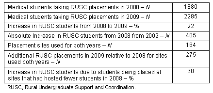 As is shown, of the 22% increase in students undertaking rural rotations in 2009, 68% were accounted for by students being placed at sites that had hosted fewer students in 2008 (Table 1). This raises the possibility that medical schools are compensating for the larger cohorts of students by sending larger groups of students at the same time to the same preceptor.