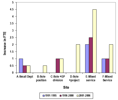 The dietetic workforce across the six sites, increased by a net of 22.6 full-time equivalent (FTE) positions, a 5.6-fold increase over the 15 years. Increases in dietetic staffing for the six sites separated into 5 year periods for the study period (1991-2006) are shown (Fig1). In the cases of sites D, E and F, the largest increase in dietetic positions occurred in the last 5 years.