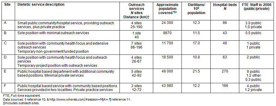 Six rural sites from the Hunter New England Health (NHEH) service area of NSW were selected for a case study examination of the development of dietetic positions in the local area over a 15 year period (1991-2006). The six sites were chosen because they represented different models of dietetic service delivery within the same geographical and health service region. Models of dietetic service delivery included a mix of public hospital and community based services with variable private services, as described (Table 1).