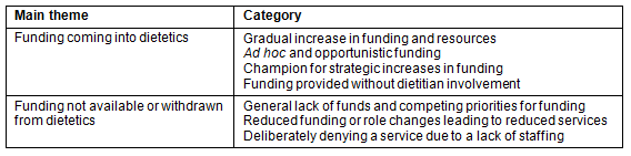 General lack of funds and competing priorities for funding: A general lack of public funds was identified as the main barrier to attracting additional funds or reallocating funds to dietetic staffing in rural areas. The scarcity of additional funding and the limited access to this funding at a local health service level was reported in a number of sites.