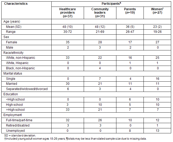 Most participants were female (94%), non-Hispanic White (94%), and married (65%); Table 1. All healthcare providers and community leaders reported having at least a high school education, but 36% of parents and young adult women indicated they had not completed high school. Almost all healthcare providers (91%) and community leaders (90%) were employed full-time or part-time, with fewer parents (56%) and young adult women (46%) indicating current employment.