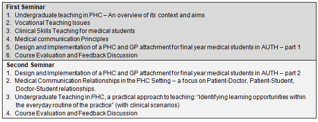 The seminar syllabus aimed to inform the multi-professional teaching staff about the framework for undergraduate teaching in PHC; to present the needs of medical students and their level of competence; to introduce the principles of medical teaching; to strengthen their medical communication skills and help them identify useful teaching opportunities. The specific lectures, teaching items and discussion topics that comprised each seminar are shown (Fig2).