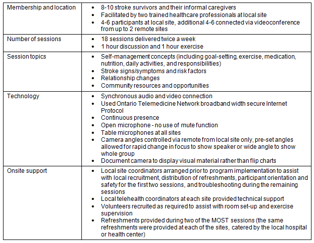 MOST® is a group-based, self-management program for stroke survivors and their caregivers living in the community24 (Table 1). The program provides information about stroke-related topics and facilitates discussion, problem solving, goal-setting, and self-management skills in a supportive environment25. Participation in MOST is associated with improved community reintegration and positive health behaviour changes in stroke survivors24. An initial pilot study investigated the feasibility of using videoconference technology between urban centres to co-facilitate MOST26. A subsequent study27, MOST Telehealth Remote (MOST-TR), used videoconference technology to connect facilitators and Thunder Bay participants with stroke survivors at remote videoconference sites in NWO.