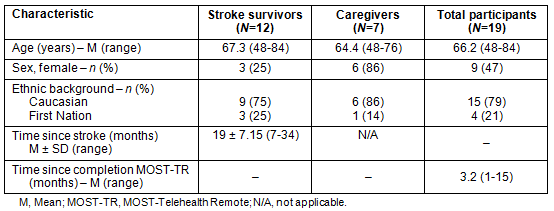 Remote participants from MOST-TR were recruited post-program completion. Community-dwelling stroke survivors between 3 and 18 months post-stroke, and their caregivers were recruited to achieve a range of experiences30,32; and were chosen from different sites with varying numbers of local participants. Purposive sampling included women and men, younger and older participants, quieter and more active participants, stroke survivors and caregivers, those who completed the program and those who dropped out before completion.