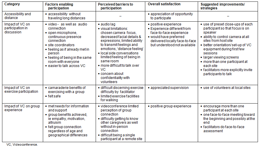 This research shows that videoconference technology has the potential to meet the need for community-based programming and exercise for individuals living in remote areas. Both facilitators and participants need to recognize that there are differences between videoconference and face-to-face participation. Future programs may wish to incorporate and strengthen where possible the supportive factors identified in this study, and explore solutions to overcome identified barriers to group videoconference implementation. This may increase meaningful access to group interventions, including social support programs and exercise programs, for residents in rural and remote areas where both patient numbers and healthcare resources are limited.