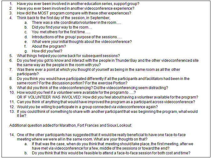 The majority of the MOST-TR participants thought that the videoconference connection made no difference to their level of participation and that they were able to participate at the same level as if they were there face-to-face. It is possible that the participants' need and desire for support from others in a similar situation was met with the videoconference format and thus eliminated a need for a more intimate in-person experience. However, participants also said that they would have enjoyed more time for discussion, and some said that they desired more time to socialize informally, share stories and get to know each other.
