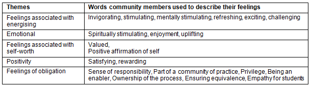 There is a strong sense of reciprocity identified by community members. In giving their time and expertise to the process they receive back many positives. This includes the acquisition of new knowledge and skills to apply to own work place and their professional development and a sense of personal growth. In representing the broader community there is a strong sense of responsibility and privilege. This is accompanied by feelings of increased self worth, positivity , energising and in some cases strong emotions.