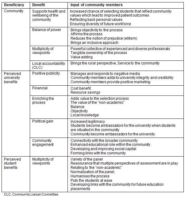 - What do you think are the benefits to: (a) you, (b) the students, (c) the University, and (d) the community in general, of community members being involved in selecting students into medicine?