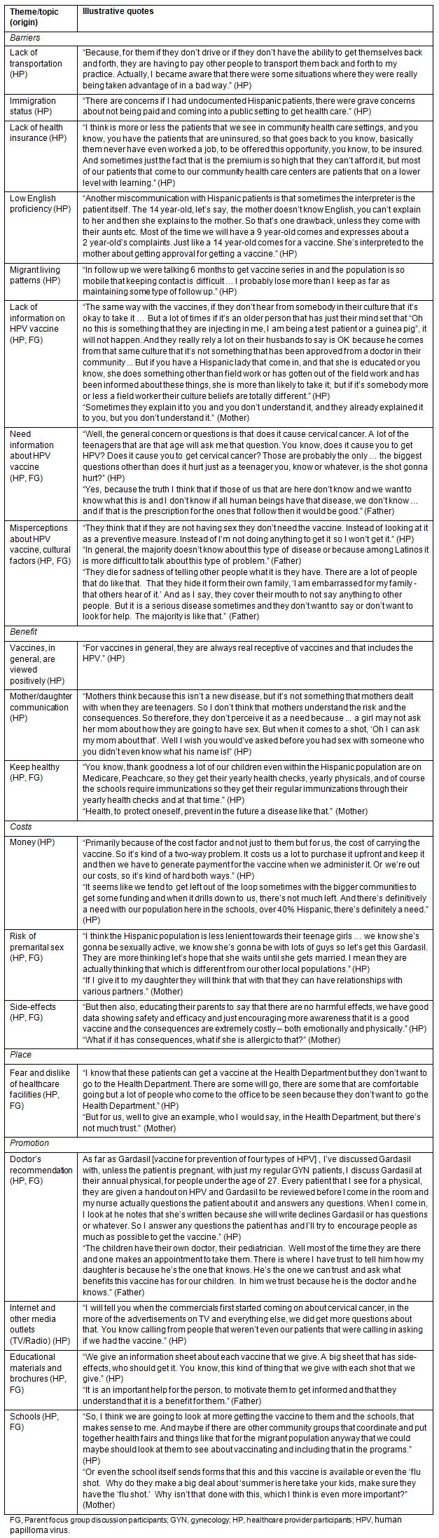 The two focus group discussions with mothers and fathers revealed that most Hispanic parents were not aware of the HPV vaccine, nor the VFC program. One mother said that the schools should promote the vaccine to increase access and awareness. Another mother believed that a patient needed to see a gynecologist before receiving the vaccine. Fathers were mostly unaware of the HPV vaccine, compared with mothers. However, both mothers and fathers expressed positive views toward childhood vaccinations. There were exceptions, however. For example, one mother believed that if her daughter received the vaccine, she might pursue sexual relations with multiple partners as a consequence. The parents identified numerous barriers to HPV vaccination for their daughters including: (i) undocumented status preventing access; (ii) fear of not knowing about cancer; (iii) cultural issues, especially related to diseases caused by sexual behaviors; (iv) low English proficiency; (v) lack of information; and (vi) distrust of particular healthcare facilities. Illustrative quotes from the VFC provider interviews and parent focus groups are organized and presented by thematic code (Table 2).