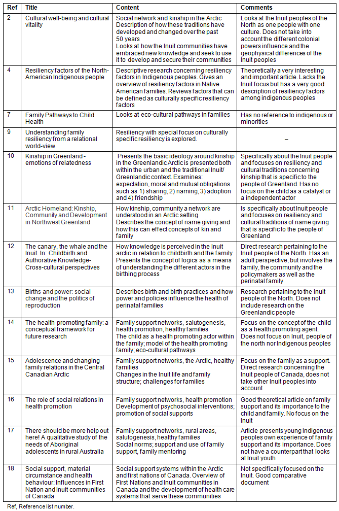 The present literature search focused on topics of family supports systems, healthy families and the child as the health-promoting actor. Primary and secondary searches were executed using the keywords and combinations of keywords: healthy families, health promoting families, resiliency, Arctic, Inuit, family support. Although one of the goals was to focus on the Nordic countries of the Arctic including Sweden, Finland and Norway, no relevant articles were found in the primary searches of PubMed, Popline, CSA and CINAHL. The tertiary literature search was then combined with literature gleaned from literature lists and 13 other relevant articles were selected (Table 1).