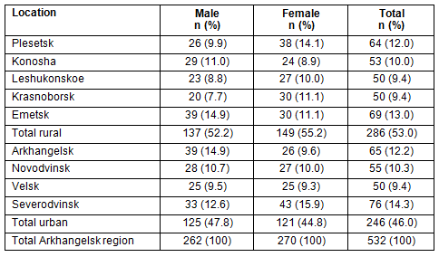 Participants were recruited in 5 randomly selected rural settings (Emetsk, Plesetsk, Konosha, Leshukonskoe and Krasnoborsk) and 4 urban settings (Arkhangelsk, Severodvinsk, Novodvinsk and Velsk) of the Arkhangelsk region. Altogether, there are 13 towns and 20 rural districts in the region so the study includes 30% of the towns and 20% of the rural districts. Arkhangelsk, Novodvinsk, Severodvinsk and Leshukonskoe are situated in the northern area and two areas (Emetsk and Plesetsk) are in the central part. All other settings are located in the southern area of the region (Fig1).