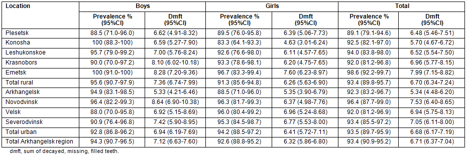 Table 2: Prevalence and experience of dental caries with 95% CI by setting and sex among 6 year-old children in the Arkhangelsk region, 2007-2008