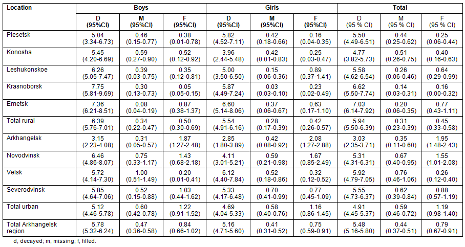There were on average 5.48 (95%CI: 5.16-5.80) decayed teeth per child. The mean number of decayed teeth in rural areas was higher than in towns (5.94 vs 4.91, p=0.001). There were more decayed teeth in boys than in girls (5.78 vs 5.16, p=0.038). Children in the regional capital had significantly fewer decayed teeth than children in rural towns Novodvinsk, Severodvinsk, Velsk and all rural areas (all p<0.001) but not Konosha.