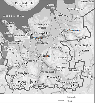 Figure 1: Map of the Arkhangelsk region, Northwest Russia. Urban and rural