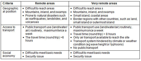 According to Indonesia's Ministry of Health Decree No. 949 of 2007, there are two degrees of remoteness, namely remote areas and very remote areas, and this division is based on geographical position, access to transportation and the social economy (Table 1)7.