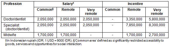 A medical specialist who serves in a very remote area earns 10,350,000 IDR or approximately 1150 USD per month (~1 USD = 9000 IDR; Table 2). A study by the MoH Indonesia in 2007 found the incentive package was moderately satisfactory to PTTs; however, even this did not have a significant impact on their willingness to stay in very remote locations14.