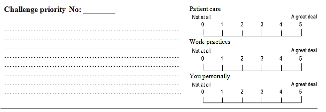 - Phase 2: focus group discussions of the top ranked challenges drawn from an analysis of the survey questionnaires. Focus groups members were provided with a summary of these survey findings. They were then asked to discuss these challenges from their own perspective and comment on how the challenges impacted on patient care and on their personal and professional lives.