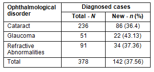 Among the 378 patients suffering from cataracts, glaucoma, and refractive errors, 142 cases (14.9% of the total sample) were newly diagnosed (Table 2). There were 22 newly diagnosed cases of glaucoma (43.1% of total glaucoma cases).