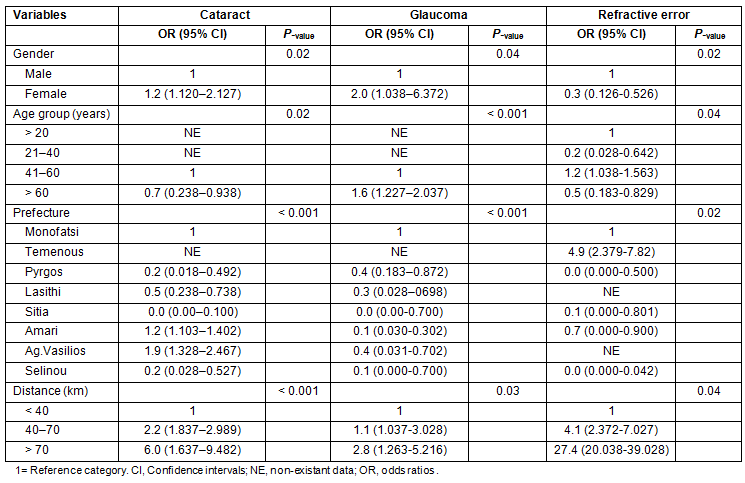 The ratio of newly diagnosed cases to already diagnosed cases was extremely high, with glaucoma having the highest ratio. Because glaucoma progresses silently for a long period before it induces symptoms, people are less likely to seek ophthalmological consultation early in the disease course. As can be derived from the results, there is no effect from the demographic variables (age, sex), but there is a higher risk for cataracts and refractive errors in people living in rural areas, especially remote areas, due to difficulties in accessibility. This result indicates that there is insufficient ophthalmological service coverage in remote villages in the island of Crete.