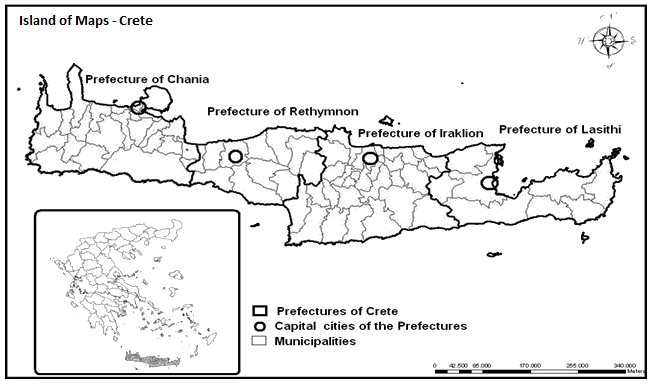 Figure 1: The geographic position of Crete, showing prefectures and municipalities.