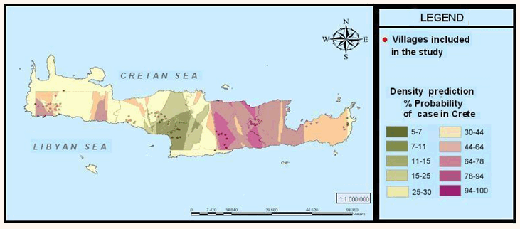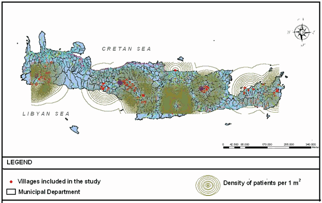 A map showing the prefectures and municipalities of the island of Crete and Crete's geographic position is provided (Fig1). A following density map shows the number of sample patients in villages per m2 (Fig2), with density represented by a circle symbol of increasing density as the number of patients increases. High heterogeneity and high density levels existed in villages in southern Asterousia, eastern Rethymnon, and southwestern Chania. However, lower densities were found in southwestern Rethymnon and the Prefecture of Lasithi.