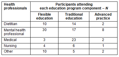 Program outcomes: A total of 137 individuals participated in the program, from a range of health professional backgrounds. Relatively low numbers of nurses and medical practitioners enrolled in the self-directed and advanced practice components of the program (Table 1).