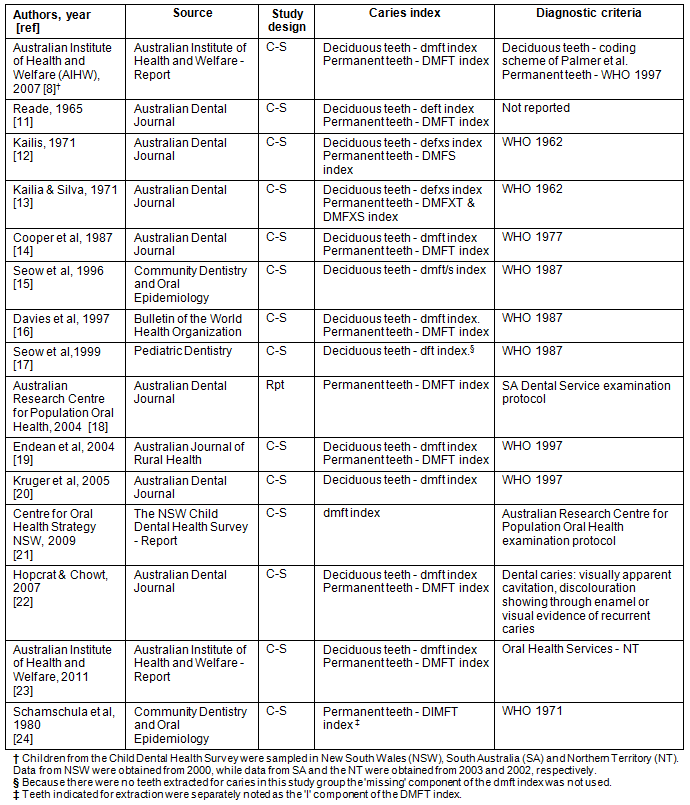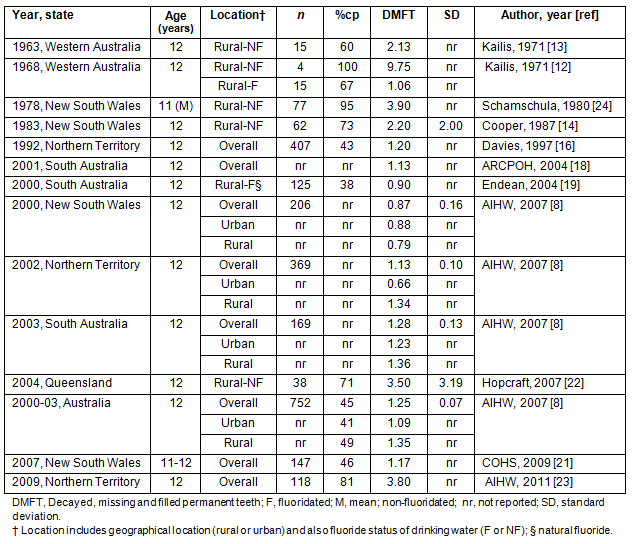 Information is provided on the selected study characteristics (Table 1). Data were extracted for children up to 18 years of age; however, for comparative purposes across studies, the main focus is on the WHO benchmark ages of 5-6 years for the primary dentition, and 12-year-olds for the permanent dentition10. Information on caries statistics for non-Aboriginal children was also obtained and matched by age, location and time.