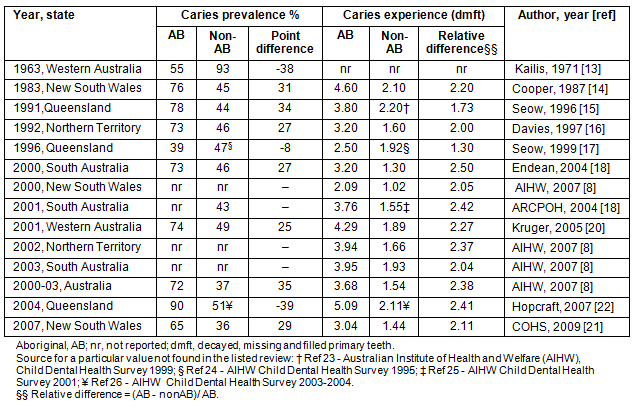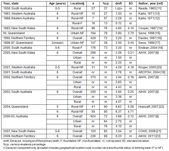 Caries statistics for the primary dentition of Australian Aboriginal children aged 2 to 6 years are given8,11-23 (Table 2), organized chronologically according to year of data collection and geographical location.