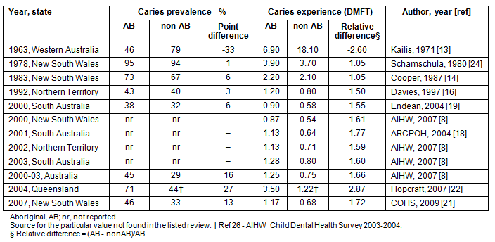 Caries statistics were compared between Australian Aboriginal and non-Aboriginal children, by time and State8,13-22,24-28 (Tables 4 & 5). In 1963, more non-Aboriginal 6- and 12-year-olds had dental caries compared with their Aboriginal counterparts. Since then the situation has reversed.