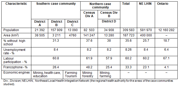 The purpose of this case study was to broadly examine access to competitive employment for persons who experience SMI and, in particular, to more fully explore the influence of place. A case study was designed to examine the experience of access to competitive employment for persons who experience SMI within and across two northeastern Ontario case communities. The cases chosen for study were two geographic areas in northeastern Ontario which provide best-practice mental health services to persons with SMI, specifically, assertive community treatment and intensive case management services. Each case community provided services in urban and rural places and could be purposively sampled for mental health users, providers and decision-makers involved in service planning and delivery. The northern case community spanned 117 400 km2 and was primarily rural. The southern case included 192 400 km2, of which approximately 35 000 km2 is rural (Table 1). The case studies were both descriptive, in that they provided a detailed account of the context of the communities within which persons within SMI lived their lives, received services and sought employment; and interpretive, because the goal was to develop conceptual categories and expand what is known about accessing employment in northern and rural places.