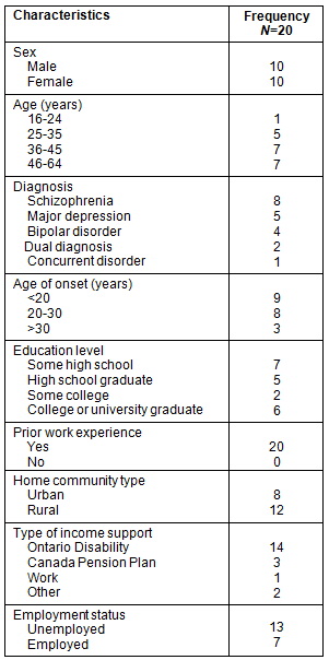 All participants completed a socio-demographic questionnaire which asked empirically-driven questions about variables known to foster employment success (Table 2). The primary data were augmented by customized statistical tables provided by the Ministry of Community and Social Services. These data tables related to the employment outcomes, tenure, earnings and economic self-sufficiency of 4112 persons with SMI who resided in the case communities and who were beneficiaries of the Ontario Disability Income Support Program (ODSP)29. The secondary data provided a portrait of employment rates for persons with SMI across the northeastern Ontario landscape during the data collection phase.