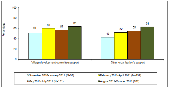 This is defined as the percentage of HFOMCs receiving any kind of support from the village development committee and other organizations in the last 12 months. There was considerable improvement in mobilization of local resources, such as receiving cash or in-kind support from the village development committees and other organizations, as the program matured (Fig3).