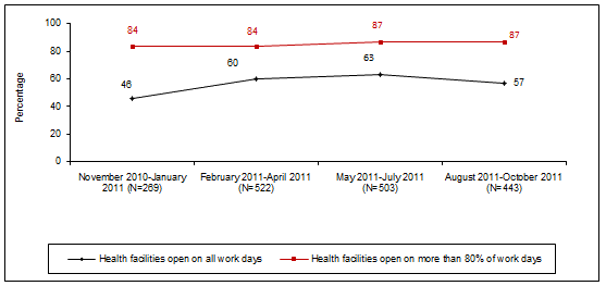 Figure 4: Proportion of health facilities open on all work days and on >80% of work days in the previous month.