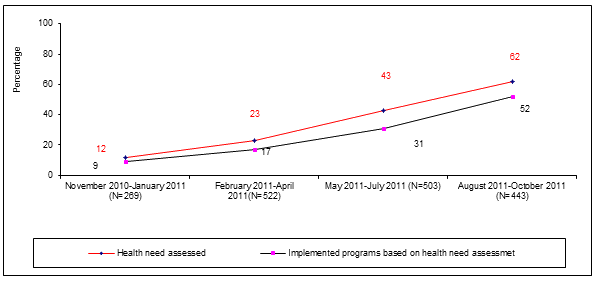 Identification of excluded groups and implementation of special program: Identification of excluded groups and implementation of special program was defined as the percentage of HFOMCs that assessed the health needs of marginalized communities and implemented at least one activity to address those needs. Such assessment increased over time and was reported to be 62% in the last quarter. Also, of those HFOMCs that conducted such assessment, the proportion that implemented their action plans also increased (Fig6).