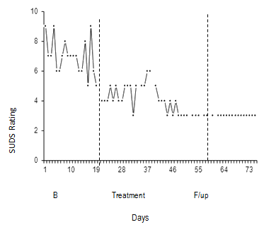 All participants were compliant with the daily ratings activity and each missed only 2-5 days during the treatment phase, which ran for 4-6 weeks. The SUDS ratings were analysed using the publically available and simply operated software package SMA v8.3.3 (http://www.clinicalresearcher.org/SMA_Windows_8_4_11.zip). Significant findings were shown, some of which were not readily identifiable on visual inspection.