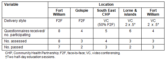 The trainer delivered the training to the first two cohorts F2F. Training to other sites was delivered through VC point-to-point, with one site connecting to the central training delivery site in any given delivery. The showing of DVDs, electronic presentations (Microsoft PowerPoint), discussions with the course tutor and demonstrations all took place through the medium of the VC suite. Two sessions were affected by technical difficulties, resulting in delays to delivery of training. In all cases, assessment of learning was undertaken one week following training delivery. The trainer travelled to the site to deliver the assessment in a F2F environment. The assessment used a simulated patient. Evaluation questionnaires were distributed at the end of the training.