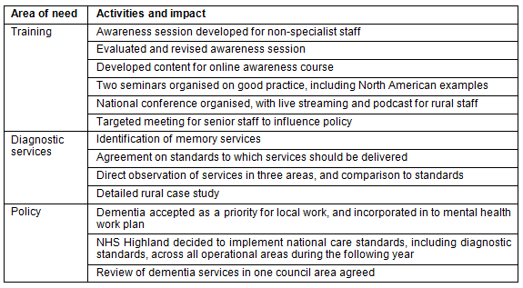 The decision to segment training to target different groups was important and NHS Highland has now commissioned a dementia training strategy for its workforce. The changed national context, with a new dementia strategy, is likely to have increased the influence of the project. The existence of this work meant that the local healthcare system was well placed to respond when the national strategy was produced.