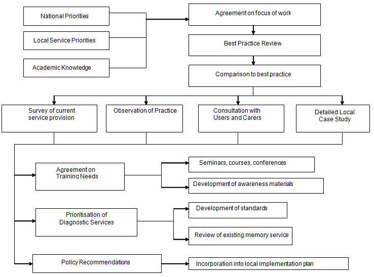 NHS Highland identified dementia as an important strategic concern and, with the University of Stirling, agreed to apply for a Knowledge Transfer Partnership (KTP). This is a UK Government funded scheme that provides matched funds to pay for academic input to industry or to public sector organisations. A 2 year project was agreed, with a University staff member (PS) dedicated to the project, supported by a senior academic (AI) and an NHS Highland manager (LF).