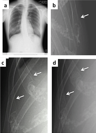 Figure 1: Findings of the rib X-ray. (a) On the 9th postpartum day: no pneumothorax or hemothorax is observed