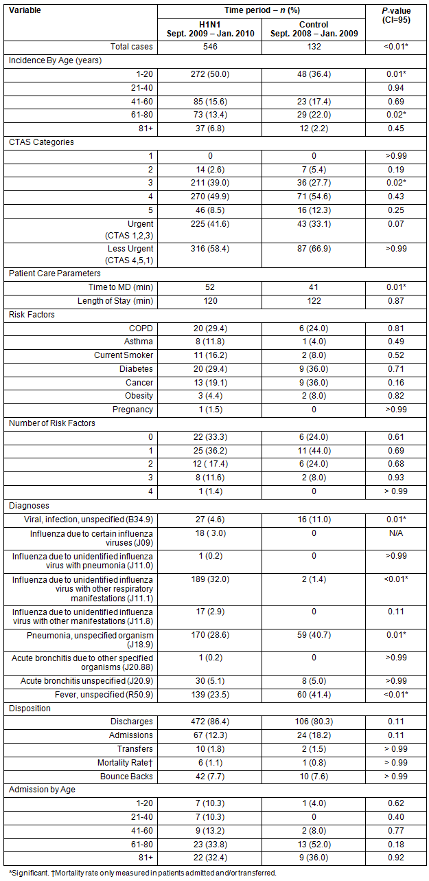 An electronic retrospective chart review was performed on all visits to the hospitals' EDs with ICD-10 codes relating to influenza-like illnesses (J11.0, J11.1, J11.8, J18.9, J20.9, J20.88, J09, B34.5 and R50.9). Chart review periods were 1 September 2009 to 1 January 2010 for the H1N1 study group, and 1 September 2008 to 1 January 2009 for the control group. Patients younger than 1 year of age were excluded because the etiology of respiratory disease differs for children in this age group. A standardized chart abstraction form was used to extract information from ED charts. Data abstracted included age, wait time, Canadian Triage Acuity Score (CTAS) category, length of stay (LOS), and disposition. For those patients admitted to hospital we also investigated pre-existing risk factors for H1N1. This chart review was performed following many of the chart review methods previously outlined14,15. The abstracter was trained in proper chart abstraction techniques and used a standardized abstraction sheet. Chart abstraction quality was measured by using a second, blinded abstracter to review 15% of the charts, and ensure inter-rater reliability. Inter-rater agreement was 99.4%. Data were complied and analyzed using Microsoft Excel v 12.0 and OpenEpi software (www.openepi.com). Two-tailed Fisher's exact tests were used to determine statistical significance for the categorical data and unpaired equal variance t-tests were used to determine statistical significance for quantitative data.