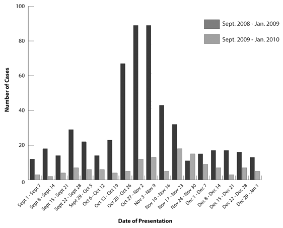 There was a 4.1 fold increase in ILI during the H1N1 pandemic period of 2009 in the two rural EDs compared with the control period. This was consistent with data from the Ontario Ministry of Health and Long Term Care16.