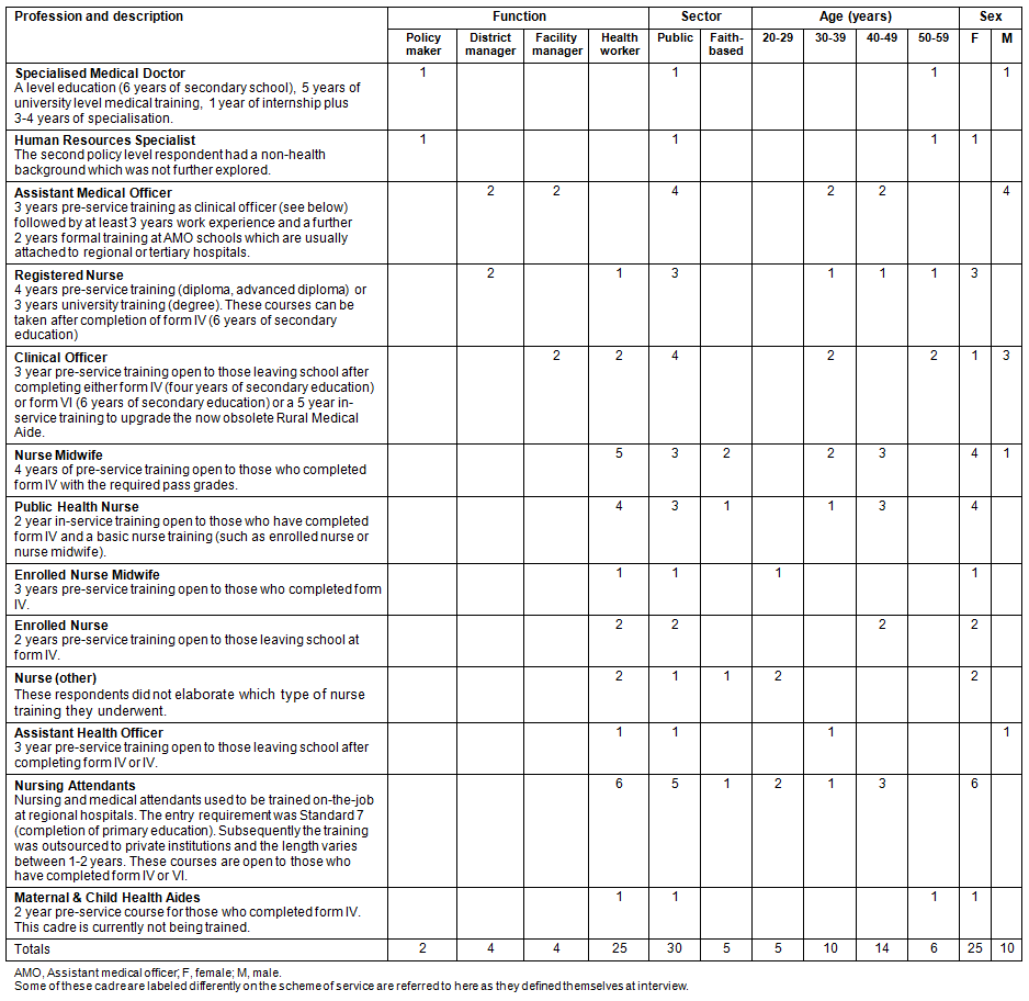 Table 1: Profile of in-depth interview respondents (data sources:23,24; Tanzania National Nurses Association, 2011; and QUALMAT project data, 2011)