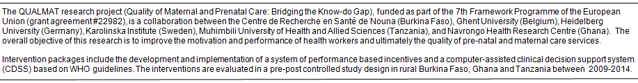 Despite progress towards the health-related UN Millennium Development Goals, improvements remain elusive in maternal and newborn health (MNH) in Tanzania1. In 2009 the maternal mortality rate was estimated to be 790 per 100 000 live births1, while the neonatal death rate was put at 33 per 1000 live births2. The causes of these persistently poor outcomes are related to the health system and overall human resource policy and management3-5 . The absolute shortage and mal-distribution of skilled health workers are contributory factors6, as are the performance and motivation of current health workers7.