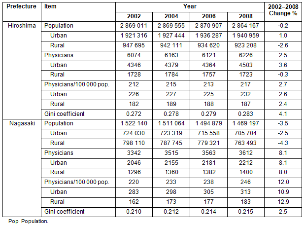 Physicians, population and Gini coefficients are shown (Table 1). The physician-to-population ratio was larger in Nagasaki than in Hiroshima. The increase of physician-to-population ratio in Nagasaki between 2002 and 2008 (12.0%) was greater than that in Hiroshima (2.7%). The increase of physician-to-population ratio in urban Nagasaki (10.9%) was greater than that in urban Hiroshima (2.6%). The increase in rural Nagasaki (12.9%) was greater than that in rural Hiroshima (2.4%). During the period, the Gini coefficient in Hiroshima Prefecture increased toward greater inequity (from 0 toward 1) by 4.1% while the increase for Nagasaki was 2.5%. This indicates that the geographic equity of physicians has worsened in Hiroshima compared with that observed for Nagasaki.