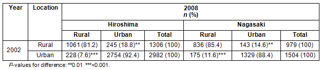 Next a cohort of physicians (identified by their unique registration number) who worked in the same prefecture in 2002 and 2008 was created and the result was 4288 in Hiroshima, and 2483 in Nagasaki. Cross-table analysis was conducted comparing the numbers of physicians classified according to rural/urban and 2002/2008 categories in each prefecture. Differences in average career length, cross-tabulated by place and year, were also examined. A similar cross-table comparison was performed using the data of a cohort of young physicians with no more than 5 years career experience (who were registered in the 2008 census but not in 2002). The size of the young physician cohort was 802 in Hiroshima and 486 in Nagasaki.