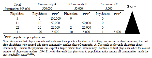 At the same time, there is also a market-derived force that 'pushes' physicians out of urban areas. Physicians are impacted by the maximization of profit and an increase in physician density will increase competition for profit in urban areas. This can move physicians towards service in rural areas with the result of improved equity of physician distribution (the spatial competition effect: Fig1)10-13. The effect of market-derived repulsion is particularly visible in countries such as Japan where there is no regulation (eg regional caps of physicians) on physicians' choice of practice location.