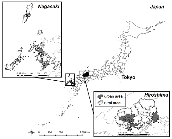 Population data were derived from 'Population and Population Dynamics Based on a National Census: National Basic Resident Register 2002-2008'20. Japan has three levels of government: municipal, prefectural and national. Data on municipal-level (city, town and village) populations in Hiroshima and Nagasaki prefectures were extracted from the whole data.