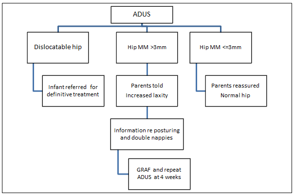 Anterior Dynamic Ultrasound is a dynamic, real-time scan which measures the maximum anterior-posterior movement of the femoral head within the acetabulum during hip abduction (MM)15. This study was designed as a Phase 1 effectiveness trial18 as the first step in implementing a large scale program in rural Australia to screen for DDH using ADUS. The research protocol with focussed management (Fig1) based on the ADUS results included: